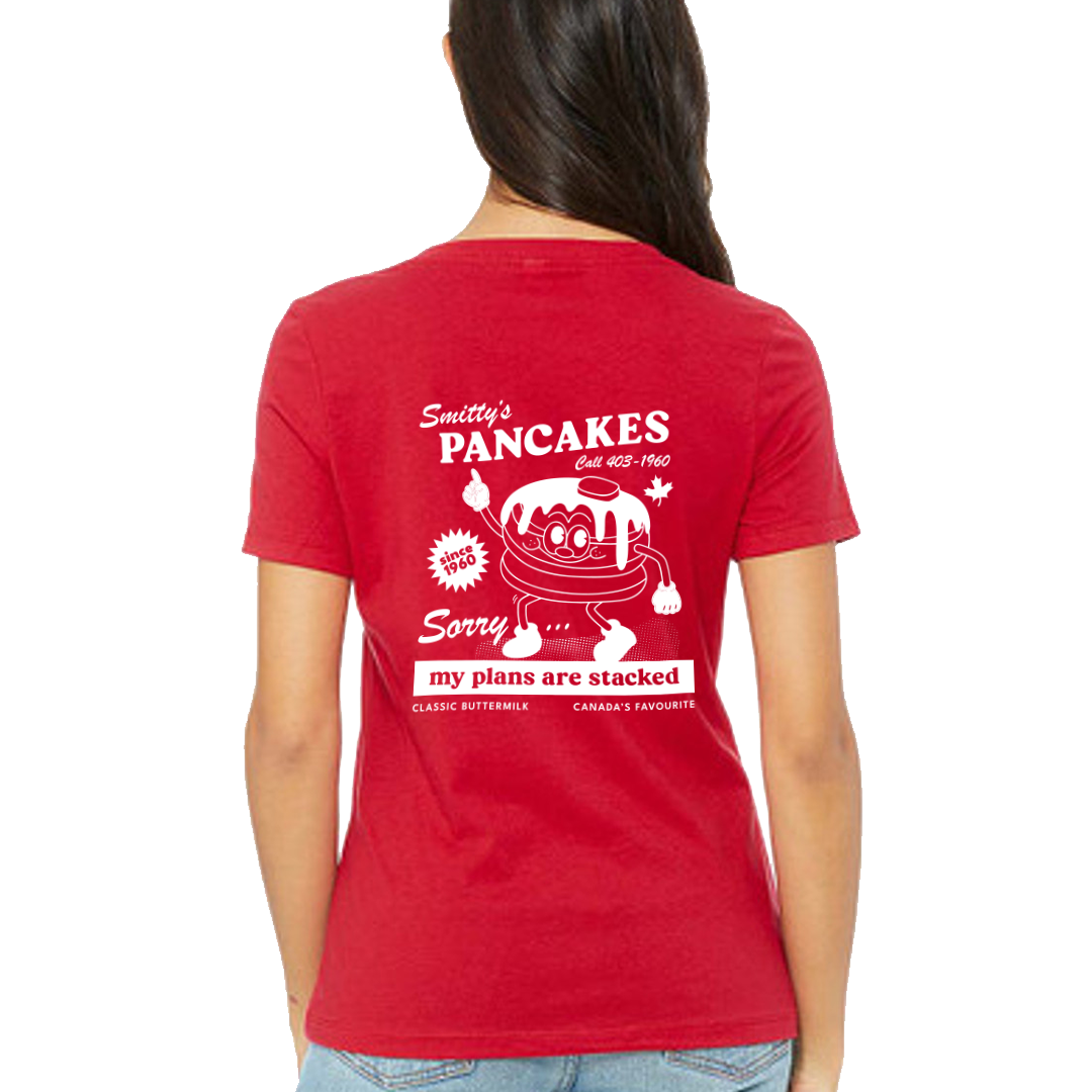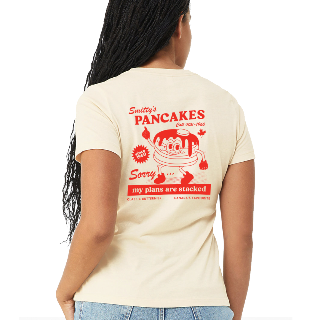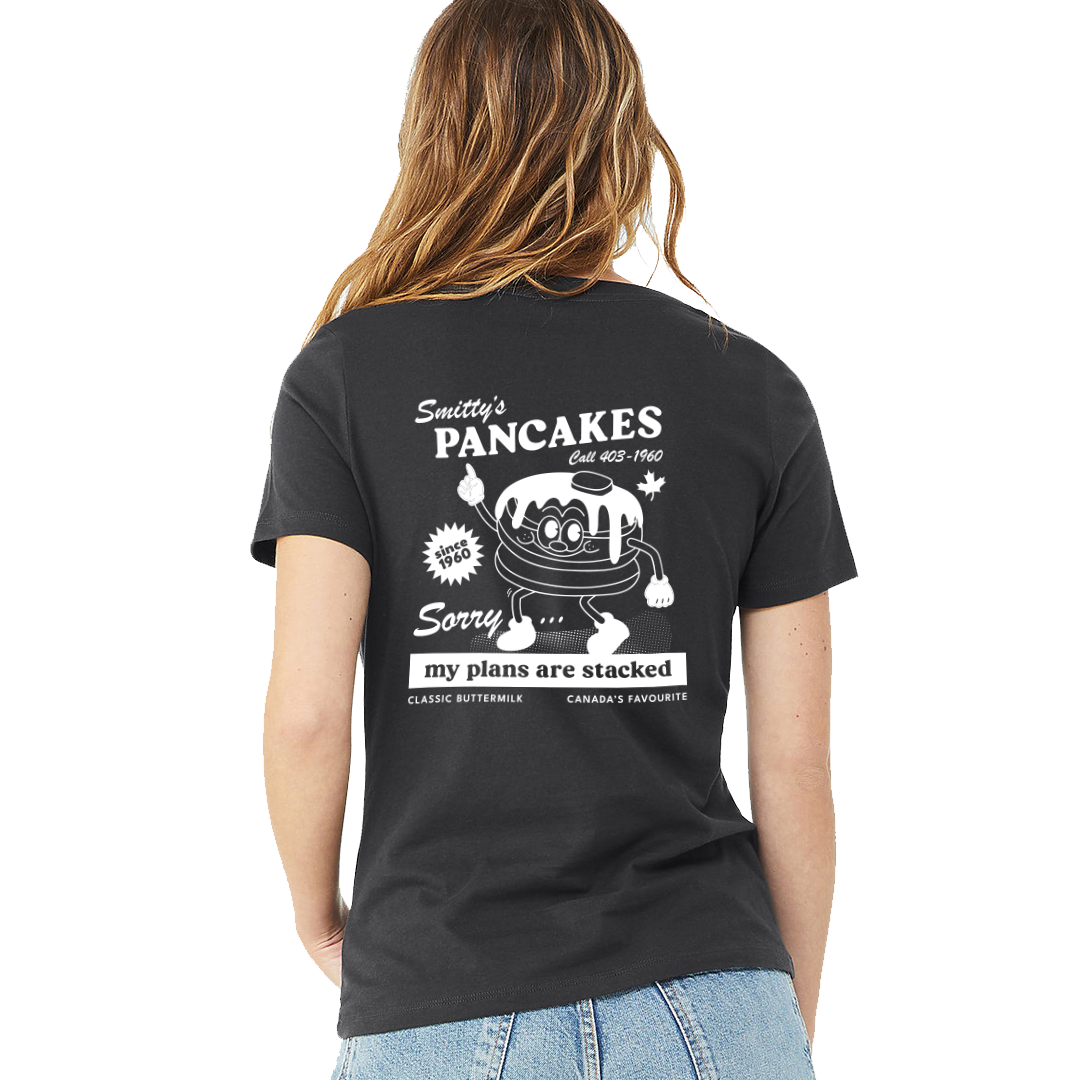 Rep Smitty’s roots with this vintage-inspired tee featuring the original Smitty’s Pancake House crest up front. Flip it around and you’ve got a bold retro graphic of our pancake mascot with the cheeky line “Sorry… my plans are stacked.”